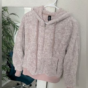 It has high quarter-zip collar, roomy fit and long-sleeves with elastic cuffs. Color is pink and white. Size small. See pictures for brand. Only worn once. Very comfortable.
