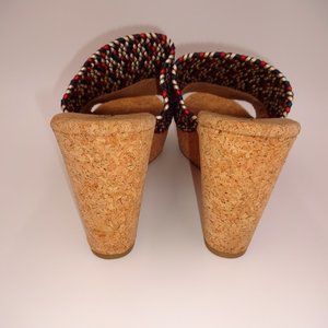 Good pre-owned condition. A pair of brown cork platforms with a wide (3-3/4"), white, blue and red stretchy "strap." Approximate measurements: heel height 4", length 10-1/4", and width 3-1/2". A few small nicks to the cork on the front of both shoes. Some bubbling to the cork on the inside of the right shoe. Wear to the soles.