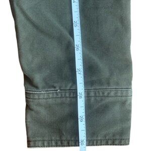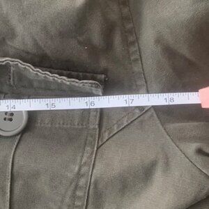 Women's size large green hooded linen coat. Button closure w/pockets and drawstrings. May show signs associated with gentle wear.