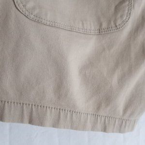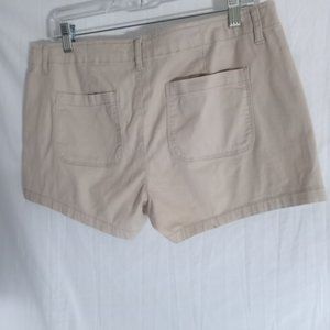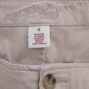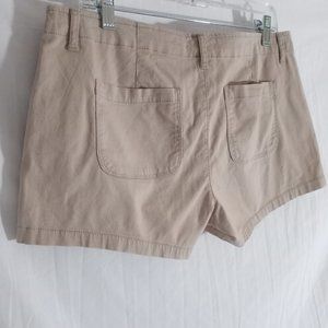 Women's Arizona Jeans mid-rise tan shorts with a button and zipper closure, and belt loops around the waist. Two front side pockets and two open pockets on the back.