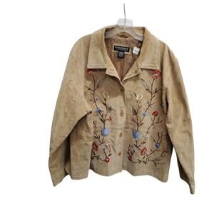 Vintage Dialogue jacket in a soft tan suede-look fabric with intricate floral embroidery in red, blue, and golden tones. Size 1X with a relaxed, slightly boxy fit. Features a collared neckline, button front, and lightweight lining—perfect for layering over dresses, skirts, or denim. Ideal for cottagecore, festival, or western-inspired styling. Pairs beautifully with flowing skirts, leather boots, or boho jewelry from my closet for a complete look.