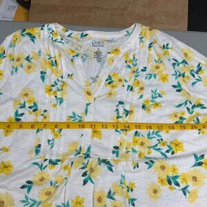 Cute women's 1X white with yellow & green flowers, 3/4 sleeve shirt/tunic w/pin tucks and v-neck on front. Pull-over. New w/o tags. 60% cotton, 40% polyester. 28.5" length, 46" across chest. Super soft!