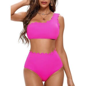 Womens 2 Piece One Shoulder Swimsuit Size Small Hot Pink High Waist