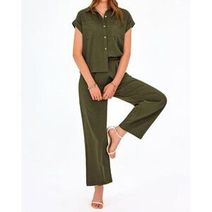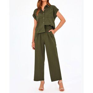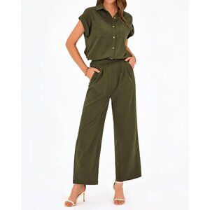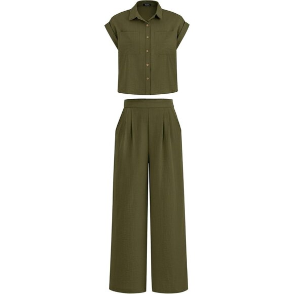 Features: This cute summer set includes a cap sleeve, button-down crop top with front chest pockets, plus high-waisted wide-leg palazzo pants with an elastic waistband for a comfy, personalized fit. Made from lightweight, breathable polyester, it's super soft and perfect for spring, summer, or fall. The wide-leg pants elongate the legs, creating a chic and effortless look. Ideal for lounging, running errands, or dressing up for casual outings.