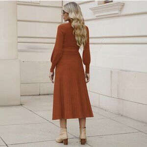 Women's 2 Piece Sweater Dress Mock Neck Puff Sleeve Pullover Knitted Top Swing Pleated Long Skirt Set, used once, Like new condition, Material: 70% viscose+30% nylon, The fabric is soft and comfortable with good elasticity. like new condition, no tag.
