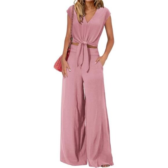 Women’s 2 Piece V-Neck Crop Top & Wide Leg Pants Set