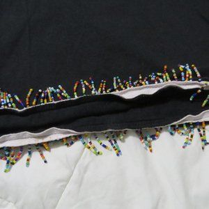 2 pc capri set by Fine Line, size Small. Great condition with no tears, holes or stains noted. Estate find. Shirt and bottoms have floral embroidered accent with beaded fringe. One strand of the beads appears longer on left leg (see photo 1). When flat, the shirt measures 20" across pit to pit and is 23" longer from shoulder to bottom. Pants have an elasticized waist measuring 11" across when flat, with a 19" inseam. Each leg has a slit on the exterior, approx. 3".