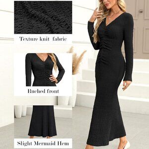 Womens 2025 Fall Winter Bodycon Maxi Dress Casual Long Sleeve Ruched V Neck Text