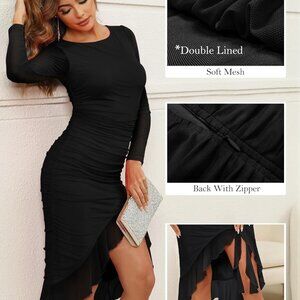 Women's 2025 Spring Summer Sexy Ruched Bodycon Midi Dress Mesh Long Sleeve Ruffl