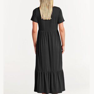 features - short sleeve crewneck maxi dress tiered flowy skirt basic cute beach dress with pockets.
