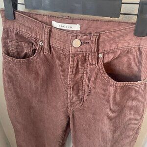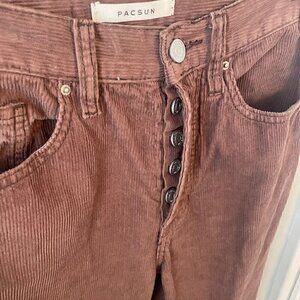 Elevate your wardrobe with these stylish Pacsun pants. The brown corduroy fabric adds a retro feel while the high rise and bootcut leg create a flattering silhouette. The button fly and solid pattern provide a classic touch, making these pants suitable for any occasion from casual to business. Crafted from a comfortable cotton blend, these pants are machine washable for easy care. The flat front and breathable fabric make them lightweight and perfect for all seasons. With accents like the Pacsun logo and functional pockets, these chino-style pants are a must-have addition to any wardrobe.