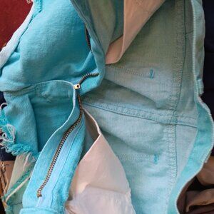 These vibrant turquoise denim shorts feature a frayed hem and high-waisted fit, offering a trendy and casual style for warm-weather outings.