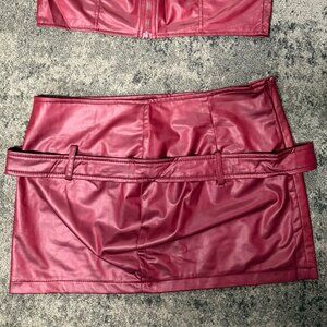 Brand new, never worn 2-piece set in burgundy faux leather. Features an elastic V-neck crop halter top with a faux leather bodycon skirt and belt buckle waist. Perfect for nights out, parties, or special occasions. Size Large. Originally $25.79. Open to offers!