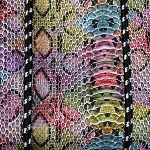 This is a lovely colorful women's purse set. It is a medium size with shoulder straps. The handle and detail are black & white woven cord, and it has a snap top closure. The bottom is firm, to hold it's shape, and it has snaps on the sides so that the top can be gathered in or let out, depending on the size you need / want. Inside is solid black, and has a hook that hold a (removable) cosmetic bag, wallet, or whatever you want to use it for. The little one measures 5"x8", and has a zipper close. The main bag's size is 15" x 9" at the bottom, and it's 12" tall. It is new without tags, and comes from a smoke-free, pet-free home.