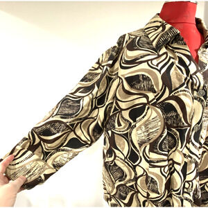 Womens 2X plus size linen rayon blend blouse by East 5th - career or casual style in an abstract brown, black, tan and cream print. Button front, collar and cuffs on the 3/4-length sleeves. The collar is a v-neck - the cuffs are turnback style. Perfect for warm weather days. Gently worn - no flaws.