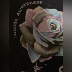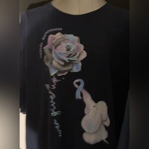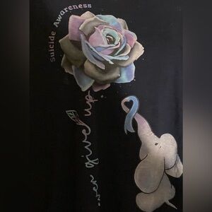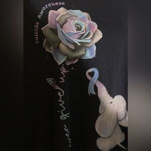 Women’s “Suicide Awareness” short sleeve tee shirt w/ beautiful colors and a rose. Also has an elephant so with this purchase you will receive a FREE GIFT, which you can see in the last few pictures; an elephant made from Perler beads (inspired by this shirt)