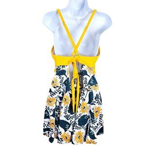 This swim dress tells a tale of summer days, vibrant blooms, and carefree moments by the shore. The sunny yellow top meets a flowing green floral skirt, while a playful backless design and cross halter straps add a touch of whimsy. Perfect for embracing sunny and water adventures.