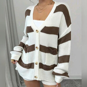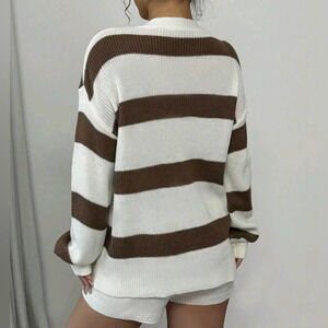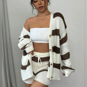 Women's 2pcs Set Long Sleeve Cardigan Sweater And Striped Shorts