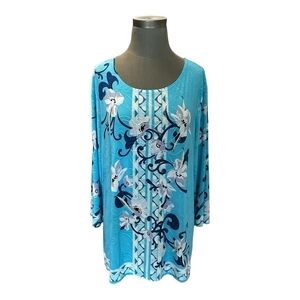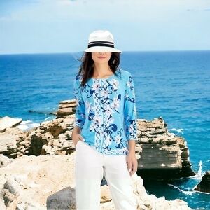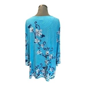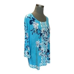Discover the chic appeal of this pre-loved JM Collection women's 3/4 Long Sleeve Blouse, featuring a striking blue #FloralPrint on a textured jacquard fabric. Designed to flatter, this XXL top offers a scoop neckline and elegant 3/4 sleeves.