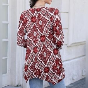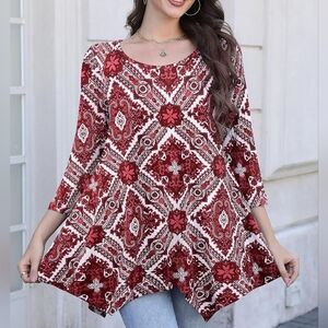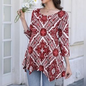 Womens 3/4 Sleeve Casual Flowy Loose Fit Swing Top Tunic, Wine Red Pattern