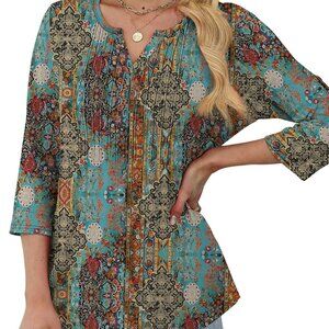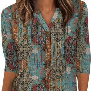 Womens 3/4 Sleeve Tops 2025 V-Neck Casual Pleated Shirts Blouses Beach Vacation