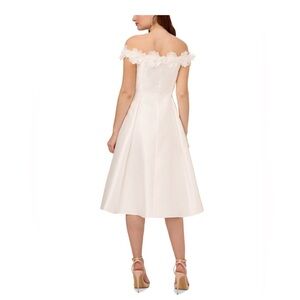 • Off-the-shoulder neckline with 3D embroidered organza rosette trim; Fit & Flare silhouette