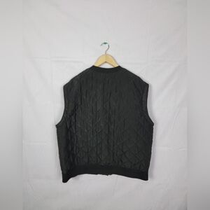 Stylish black quilted vest featuring gold buttons. Perfect for layering.