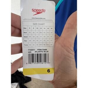 New with tags Speedo one-piece swimsuit in size 6, Atlantic Blue with aqua crossback straps and chest band detail. Protective liner still attached. Made with durable, quick-dry stretch fabric designed for swim training, water sports, or casual pool days. A versatile piece that also works as a festival or rave costume base—layer with mesh, skirts, or accessories for Burning Man and summer events. Great for resort travel, swim team, or athletic practice. Condition: new with tags. Laundering recommended upon receipt.