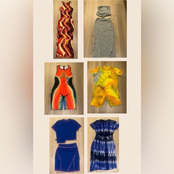 Vibrant clothing set featuring multiple colors and patterns. Includes dresses, skirt set, short set, and Sleeveless Short Bodysuit.