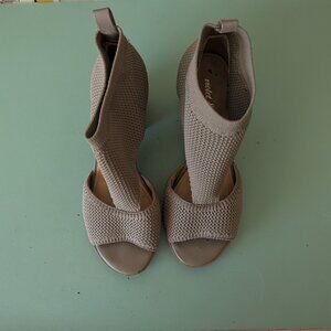Taupe color bootie with netting and heel. Some wear in tear on the bottom making these booties used but in good condition.