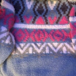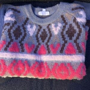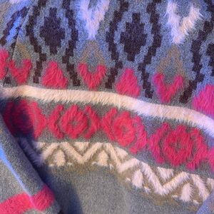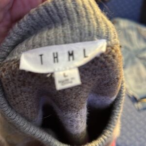 Women’s beautiful sweater size large brand is THML beautiful pattern, gray base sweater, rose, color, tan, pink and brown design, a pink, hot, pink and brown stripe towards the sleeve collar beautiful comfy sweater. Excellent condition make an offer.