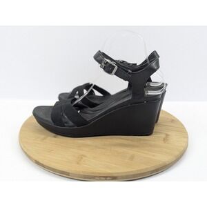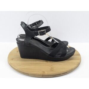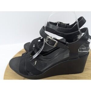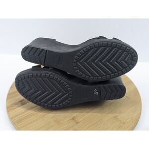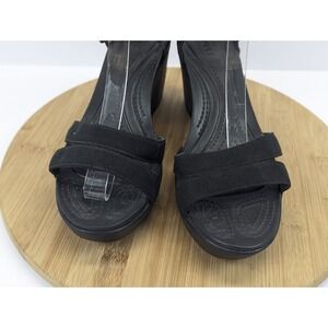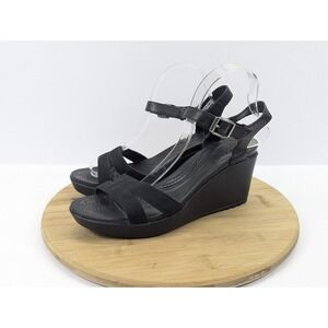 The product is a pair of women's Crocs Leigh II black casual strappy comfort wedge shoes sandals in size 10. These sandals feature a mid-height wedge heel with a buckle closure and adjustable ankle strap for a comfortable fit. Made with a lightweight and breathable fabric upper, they are cushioned and lined for all-day wear, perfect for various occasions including casual outings, parties, or even formal events. The black color and solid pattern make them versatile for summer and spring seasons. Made by Crocs with a rubber outsole, these sandals are a stylish and comfortable choice for everyday wear.