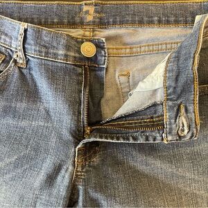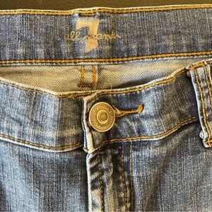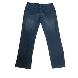 These 7 For All Mankind jeans feature a classic bootcut style in a medium to dark wash blue denim. The fabric has a subtle fading effect that adds a vintage touch, making them a stylish choice for any casual outing.