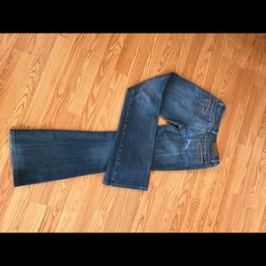 Pre-owned Women's 7 Seven For All Jeans Mankind Stretch Distressed Size 27/4 Boot cut Jeans are in excellent condition. No holes, rips, or tears. Boot cut, slight stretch, medium distressed washed.