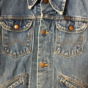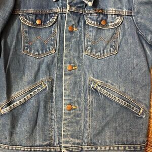 Wrangler 70’s vintage Wrangler trucker jacket with no lining. All original buttons intact. There are a few stains on the sleeves near wrists and one up near elbow. Not super noticeable when wearing. Nice worn in jacket with no tears, rips. Measurements in pics. Tag has been removed, with measurements I would size this medium to large, but please see pics.