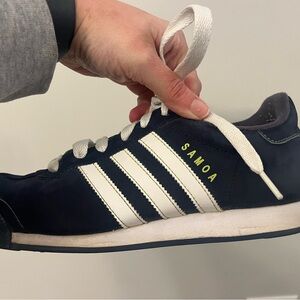 Women’s 7.5 Adidas Samoas in navy, white, and lime green