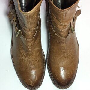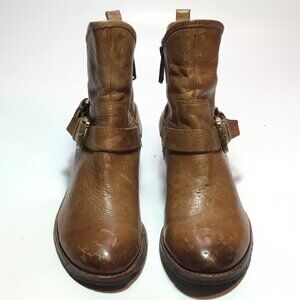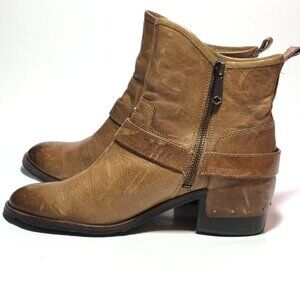 These booties are in good used condition. They have a distressed look to them. The leather is in excellent condition. No stains. The footbed is clean. The soles both have a small piece missing on the outsole. The heels are excellent, showing little wear. Please review all of the photos for condition. This item is cross posted.