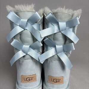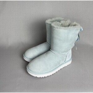 These stunning women's UGG Australia Bailey Bow boots in a breathtaking, Ether blue (baby blue or light blue) come in a women's size 8. They are no longer made in this color and very hard to find! These were worn about two times, very good condition, no foot impression, but has a spot area on the right upper boot. The shearling suede fabric and wool insole will keep your feet comfortable, warm and cozy, while you rock your show stopping boots! They are perfect for any occasion, from casual around town, holidays, school, or fun at a festival. These boots are adorned with a charming bow accent lining the heel and lined with soft sheepskin. The rubber insole material ensures durability and traction, making them suitable for outdoor or indoor adventures. They are a range from dopamine, pastel, feminine, Christmas, Mob Wife, clubwear, girl-core, Lana Del Rey, coquette, Ballet-core, boho, Malibu chic, or festival vibes. These Ether, baby blue UGG Australia Bailey Bow boots are truly show stopping!