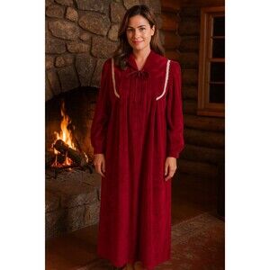 Women’s 80s Prairie Red Velvet Cottagecore Boho Victorian Maxi Nightgown Sz Med