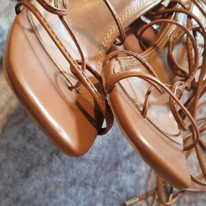 MISS LOLA caramel color square toe wrap around laces sandals heels shoes, size 9.