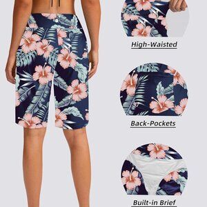 Women's 9" Long Swim Board Shorts with Pockets - Navy Flower