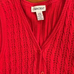 Red vintage 90s Cabin Creek knit sweater vest with buttons down the front.
