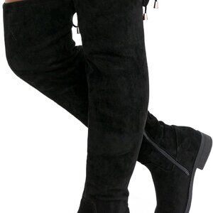 Features: Sleek synthetic suede thigh-high boots with a flattering round toe and glossy finish. Flat heel for all-day comfort, plus an adjustable tie at the top to ensure a perfect, relaxed fit. Easy side zipper for quick on and off. Great for pairing with leggings or jeans for parties, travel, shopping, or date nights.