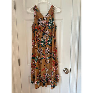 This is a pre-owned A New Day brand sleeveless midi dress in size Medium. The dress features a tan base with a multi-colored floral print including red, white, green, and black elements. It has a V-neckline with a snap closure, tie shoulder straps, a wrap-style bodice with a ruffled hemline, and an elasticized waistband.