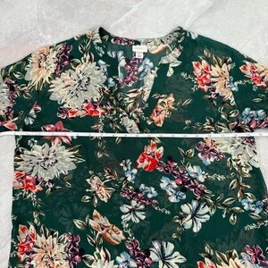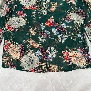 Good condition - Women’s A New Day Target Floral Sheer Long Sleeve V-Neck Top. Has v-neck design, has buttons on sleeve ends, and is sheer throughout. Colors: green, pink, red, blue, orange, black, gray, and white. Size: M.