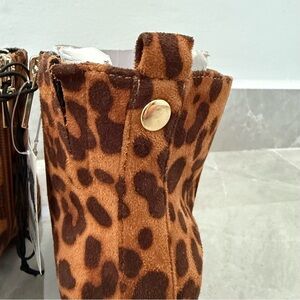 Brand new with tags - Women’s A New Day Target The Valerie Microsuede City Ankle Leopard Print Booties. Has inner side zipper closure and 2” heel. Only flaw is inside lining is peeling (as pictured). Colors: brown and black. Size: 7W.