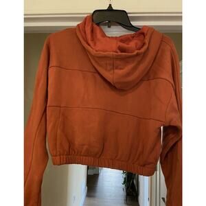 It’s a ORANGE CROPPED Style sweatshirt with ADIDAS printed across the chest in BIG WHITE LETTERS, CUTE! It also has a sewn on ADIDAS Logo on the front left side of the hoodie! It’s a PULLOVER Style sweatshirt with seams all over, Long sleeves with 3 white stripes on each cuff an ELASTIC bottom waistband and a Drawstring Hood! Size Small.
