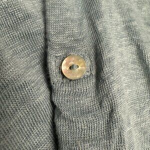 * STYLE- Linen, scoop neckline, long sleeve, roll-up sleeves with button fasteners, hi-lo hem, seashell buttons, back slit with shell button fasteners/details. Extra shell button attached.