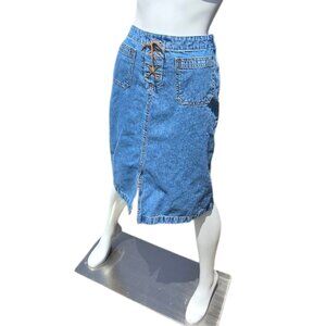 Lace up denim A-line skirt by COVINGTON. size 4. Medium was. Good preowned condition. See photos for APPROXIMATE MEASUREMENTS.