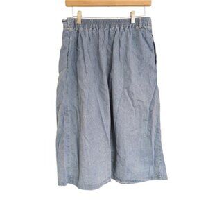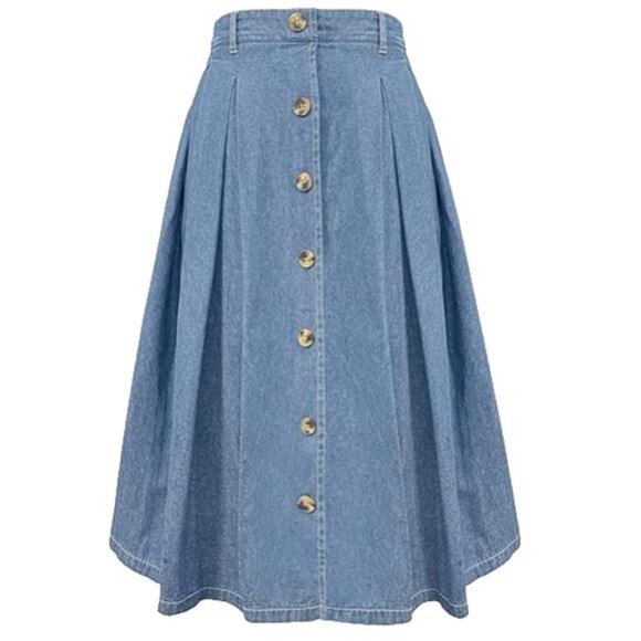 Women's A-Line Pleated Midi Denim Skirt High Waist Button Front with Pockets L